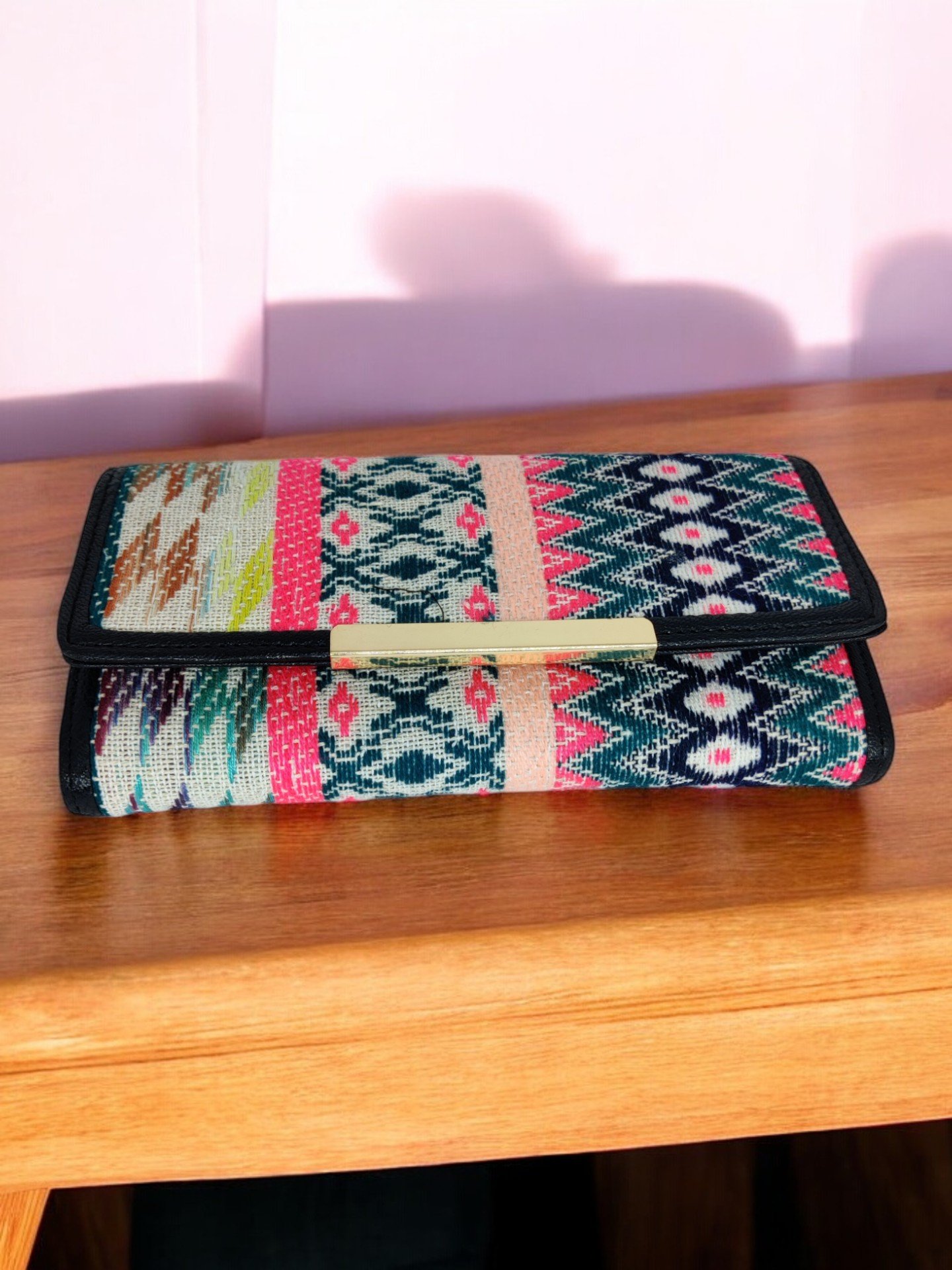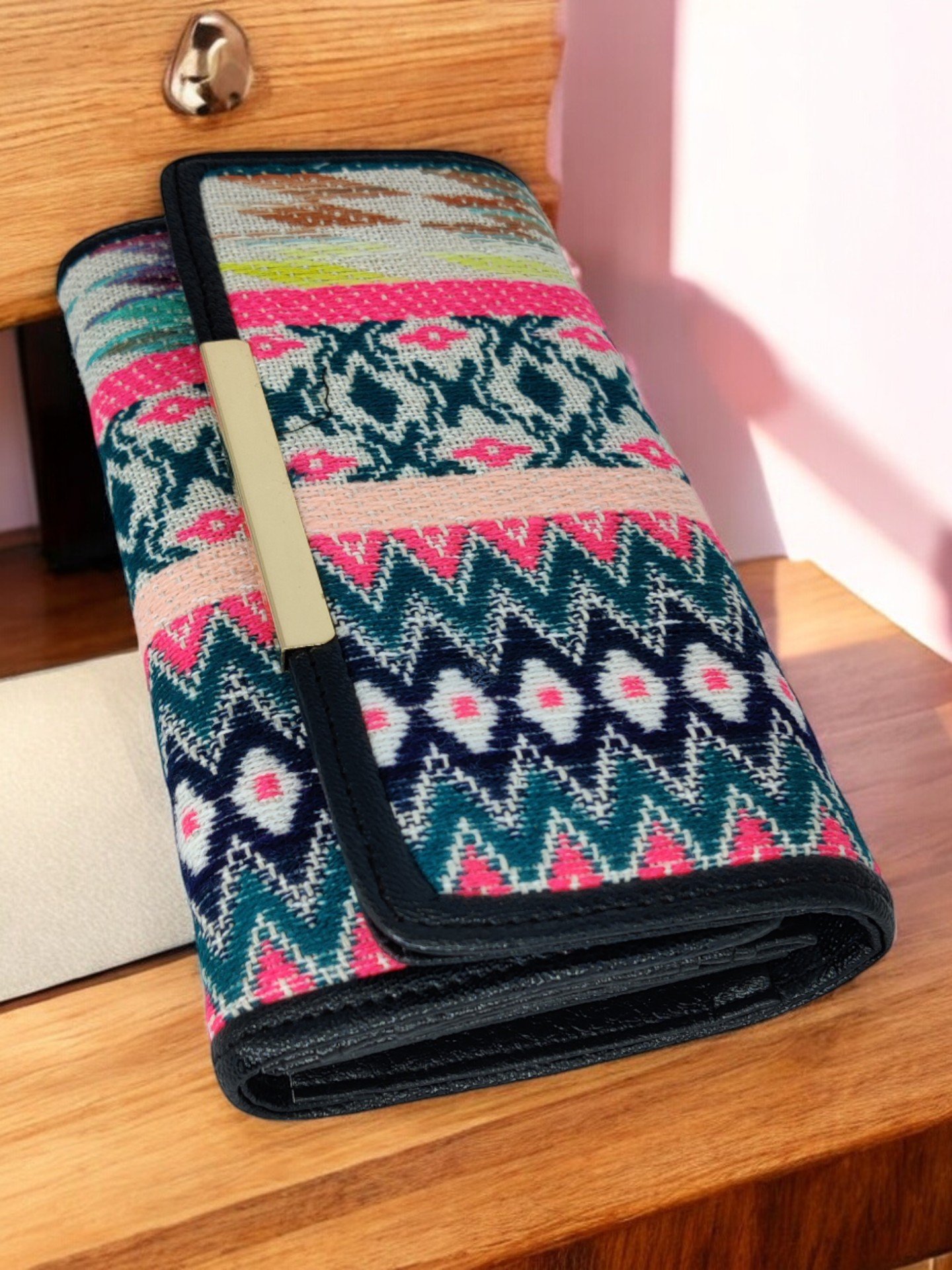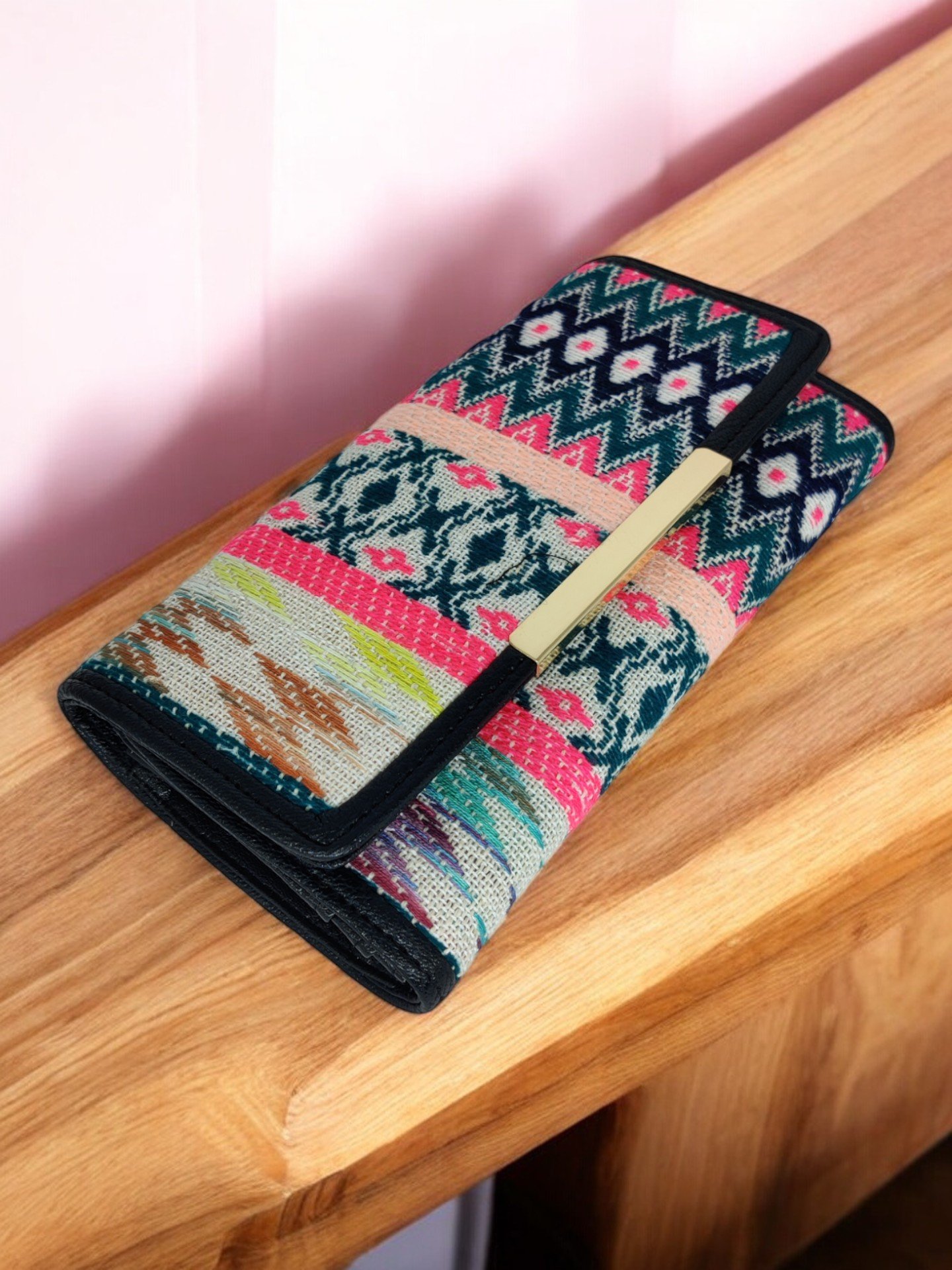 Assam Tapestry Leather Wallet – Chevron Pattern Clutch (Blue & Red)