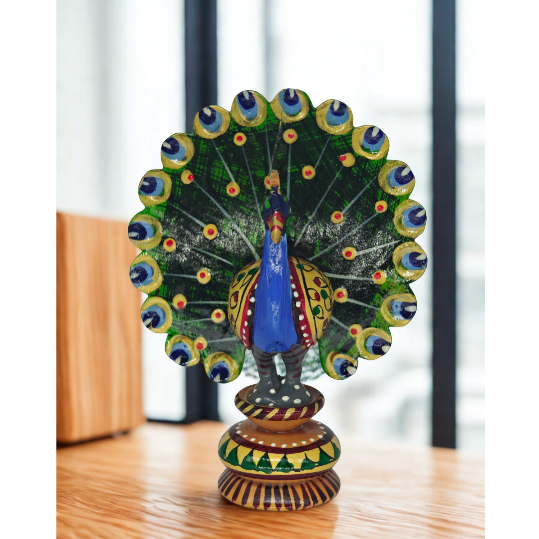 Crafted from eco-friendly, sustainably sourced wood and finished with non-toxic dyes, this decorative peacock symbolizes grace, prosperity, and positivity. Its compact size makes it ideal for display on shelves, tables, pooja units, office desks, or as a thoughtful ethnic gift.