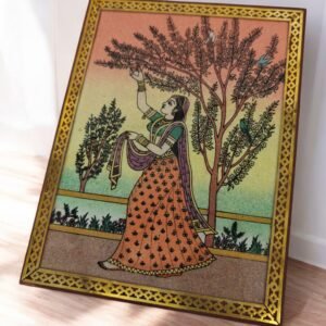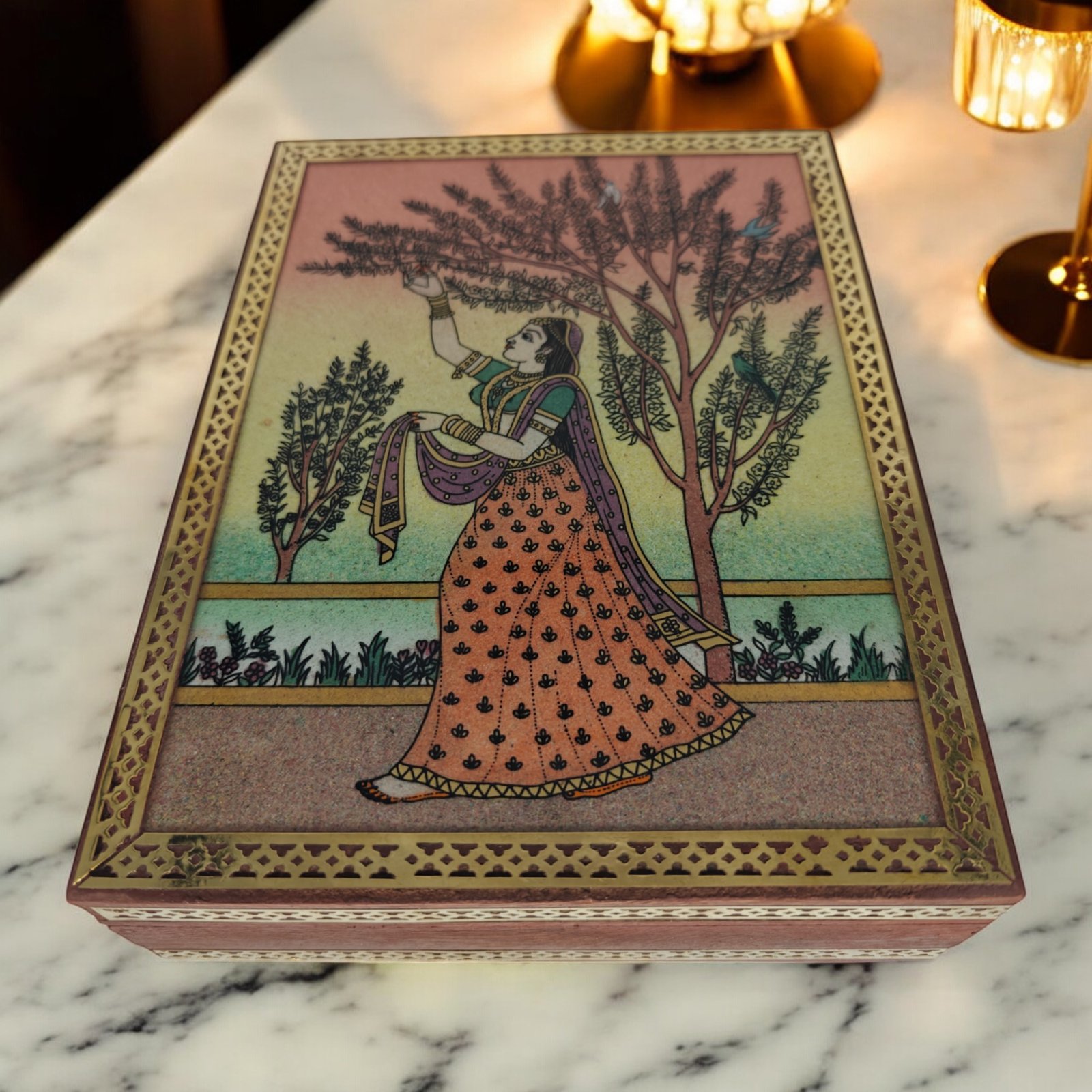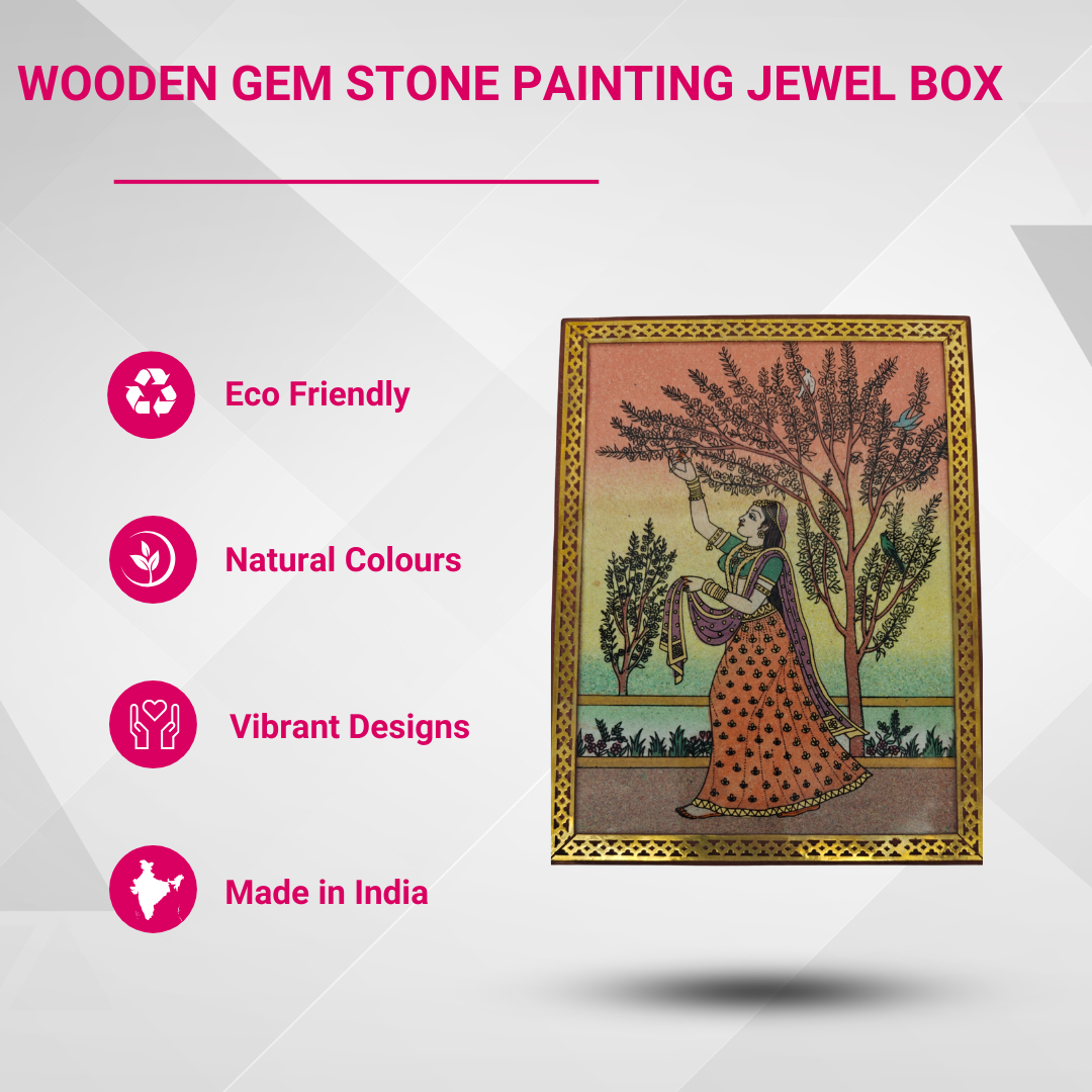 Add elegance and artistry to your jewellery storage with this handcrafted Wooden Gem Stone Painting Jewel Box. Featuring intricate gemstone painting on the lid, this box is a perfect blend of tradition and utility. Made from high-quality wood, it is ideal for keeping bangles, earrings, and other jewellery items safe and organized. Eco-friendly and crafted with natural colours, it brings both beauty and functionality to your dresser or gifting needs.