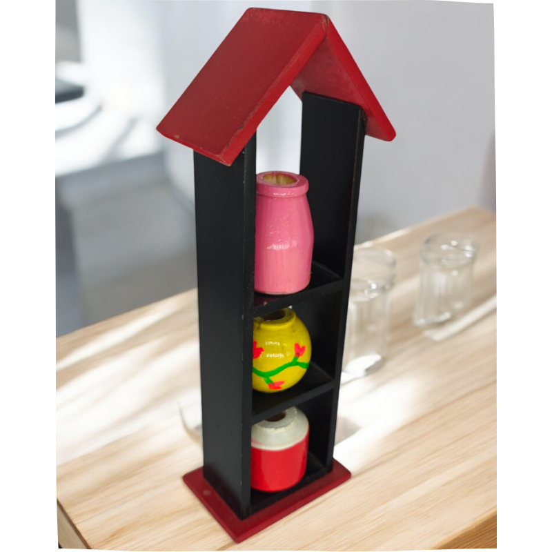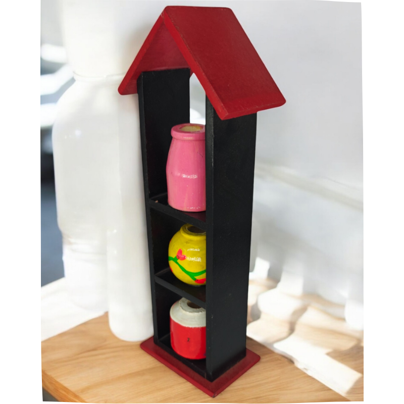 Bring home the beauty of Indian wooden craftsmanship with this miniature pot house from Channapatna, Karnataka. Featuring a sleek wooden house-shaped frame with three colorful hand-painted pots, this compact décor piece adds elegance and tradition to your living or work space.