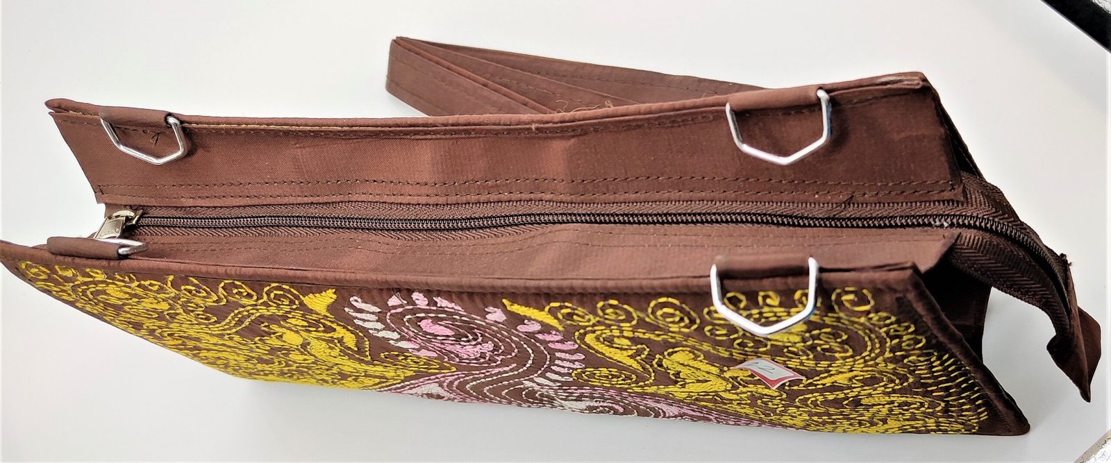 Add a touch of timeless elegance to your style with this Shantiniketan Kantha Stitch Clutch. Handcrafted from pure cotton and beautifully decorated with intricate kantha embroidery, this clutch brings together tradition and functionality. Measuring 26 x 12 cm, it is compact yet spacious enough to hold your essentials while complementing both ethnic and modern outfits.