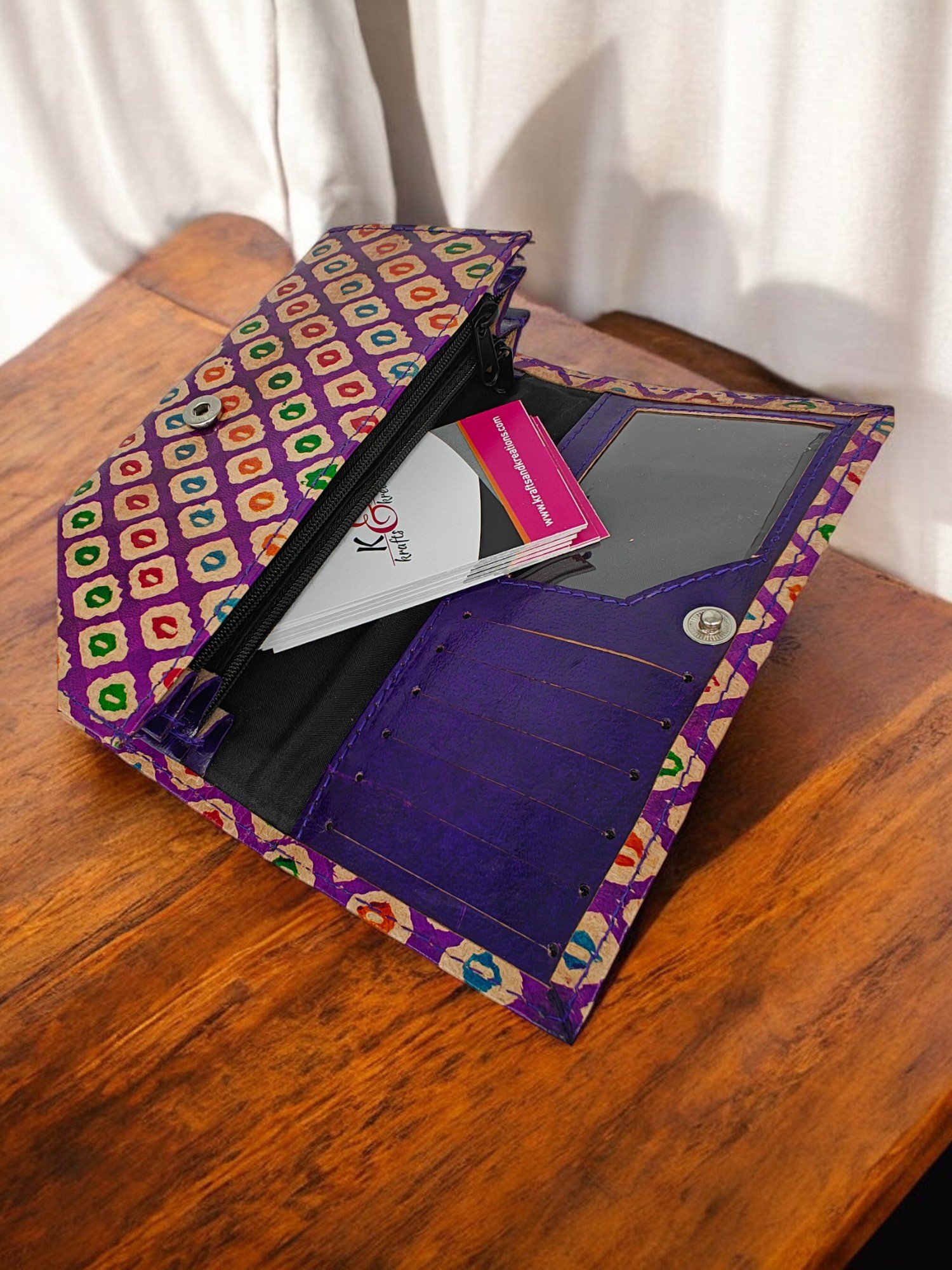 Elevate your everyday style with this handcrafted Shantiniketan Leather Ladies Batik Print Wallet. Made using traditional Batik hand-printing techniques, this wallet beautifully combines vibrant patterns with premium quality leather. Its compact yet spacious design makes it perfect for office use, daily wear, and casual outings. A true blend of art and functionality, this wallet is a timeless piece that reflects India’s rich handicraft heritage.