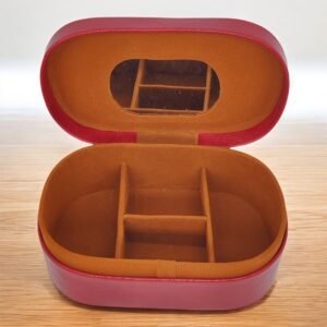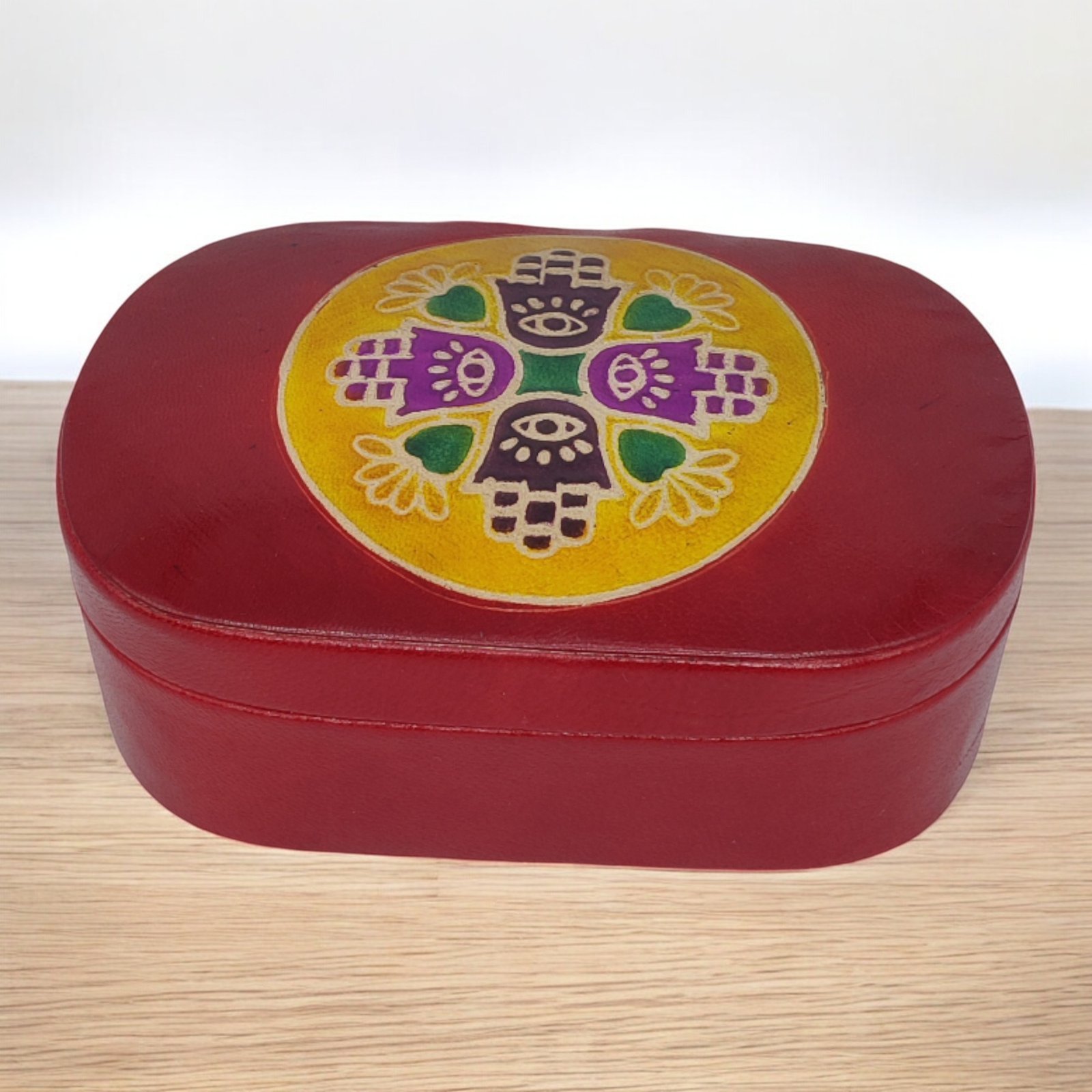 Keep your jewellery safe and stylish with this handcrafted Shantiniketan Leather Jewel Box. Featuring vibrant multicolour designs on genuine leather, this eco-friendly box is perfect for storing bangles, earrings, and small jewellery items. Compact yet durable, it is crafted using sustainable materials and natural colours, reflecting the timeless artistry of Shantiniketan craft. An elegant choice for personal use or as a thoughtful gift.