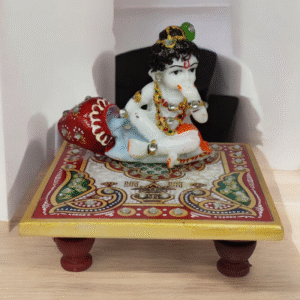 Bring divine blessings and traditional artistry to your home with this Handcrafted Marble Ganesh Idol on a 6-Corner Chowki. Made from premium quality Rajasthani marble, this idol is intricately hand-painted with red and gold Meenakari-style designs and studded with sparkling stones.