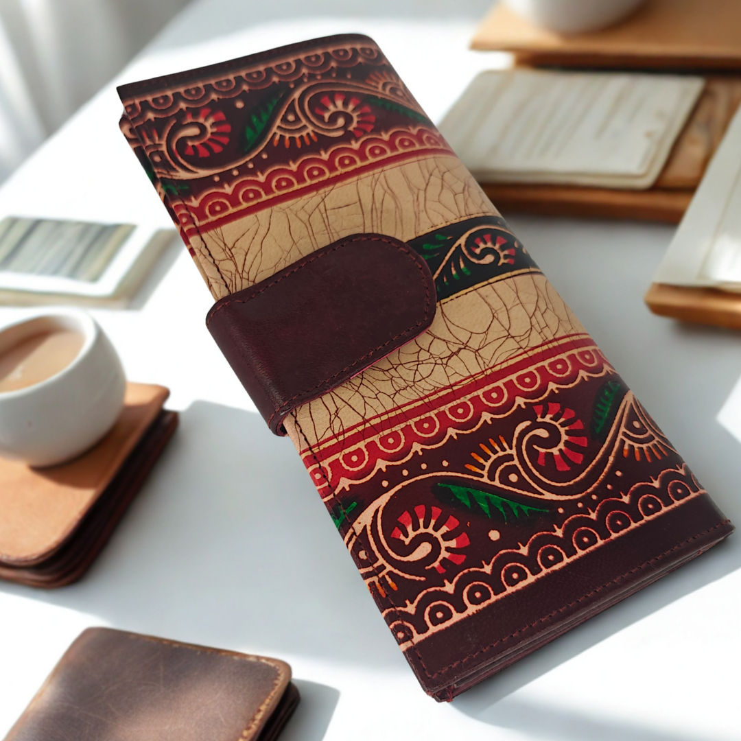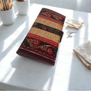 Bring home timeless elegance with this authentic Shantiniketan leather wallet, handcrafted by skilled artisans of West Bengal. Designed for women who appreciate traditional art with everyday functionality, this 3-fold batik print wallet blends heritage craftsmanship with modern utility.