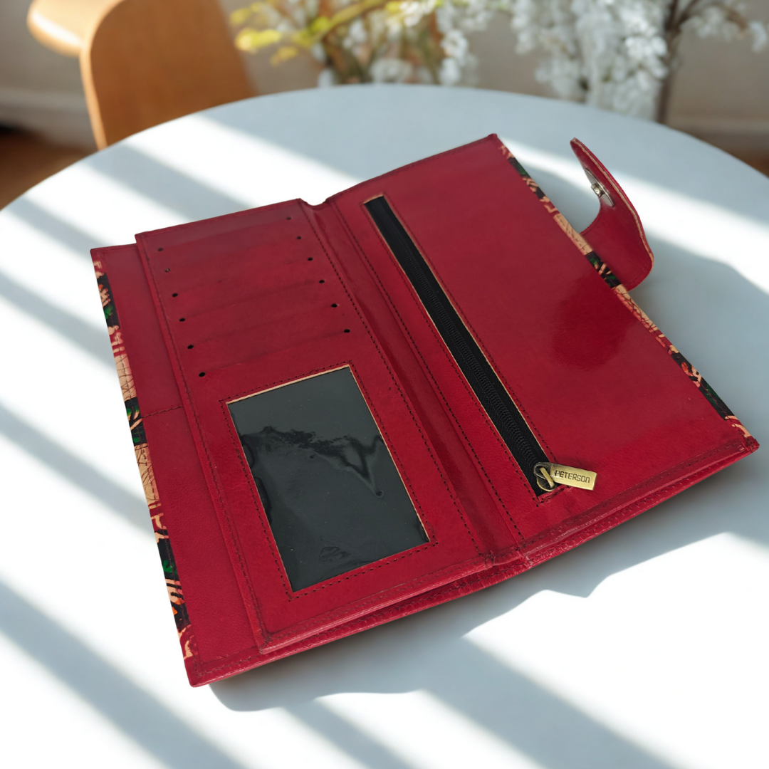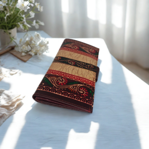 Made from genuine Shantiniketan leather, the wallet features a rich red batik print created using age-old wax-resist dyeing techniques. The structured 3-fold design ensures ample storage while maintaining a slim, elegant profile.