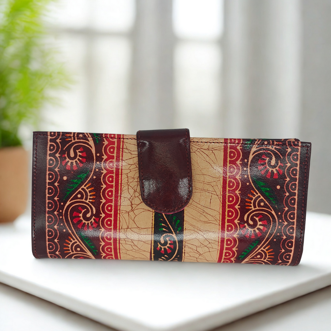 Shantiniketan Leather Ladies Batik Print 3-Fold Wallet – Brown  motif design with borders (21 cm)