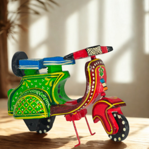 Add a touch of nostalgia and artistry to your space with this handcrafted Channapatna Wooden Scooter. Made by skilled artisans using traditional Channapatna techniques, this scooter is painted in bright multicolours with intricate detailing. Perfect as a decorative piece or a unique ethnic gift, it is crafted from sustainable wood and natural colours, making it both eco-friendly and safe for children. A true collectible that showcases India’s rich handicraft heritage.